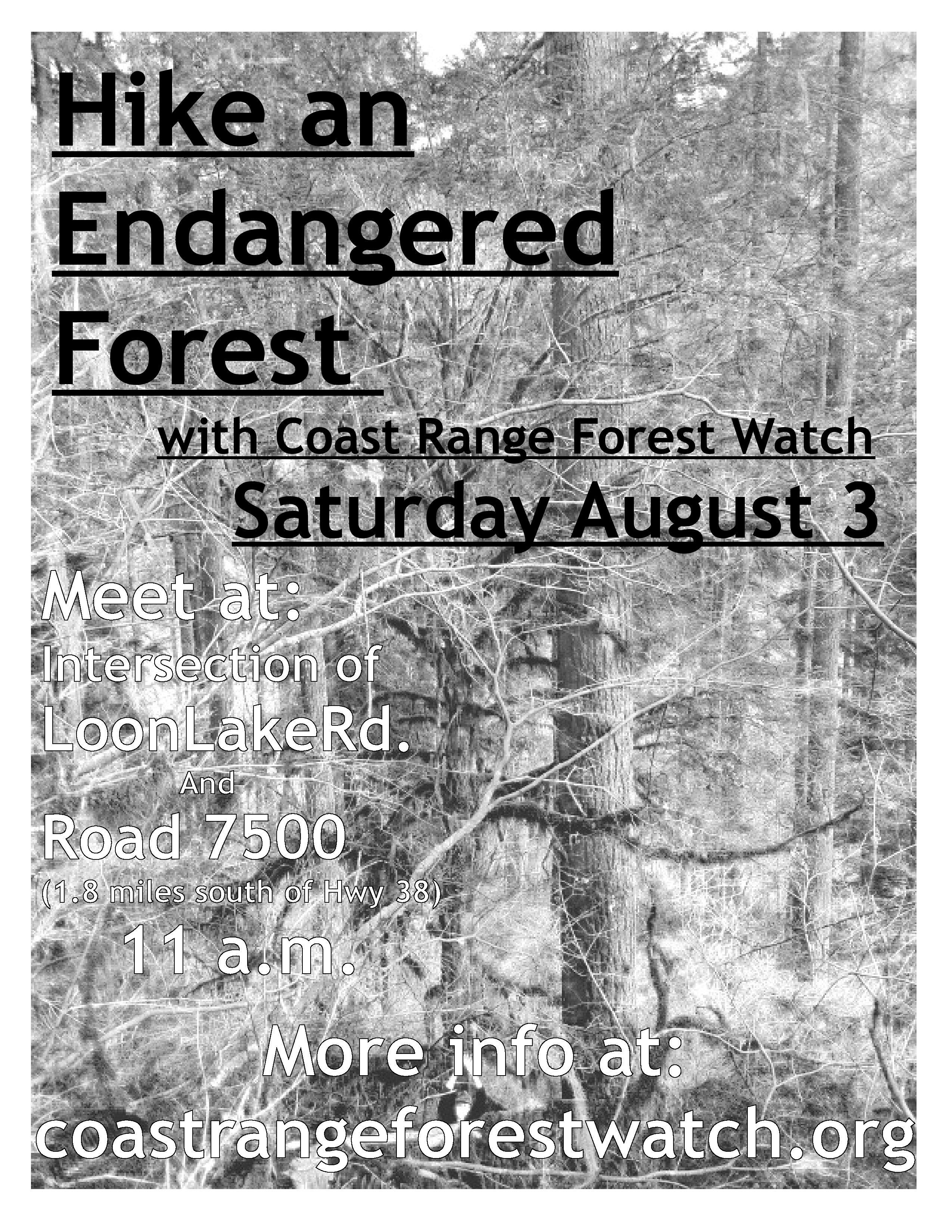 Join us on Saturday, August 3 as we hike in the Elliott State Forest. We’ll be hiking in the north east corner of the Elliott, in an area that has been part of several proposed timber sales, the latest being part of a timber auction in March 2013. While it is not currently at risk of being logged, the threat of saws loom in the distance. This diverse stand is part of the remaining native forest that regrew after the Settler Fire of 1868. This will not be a strenuous hike, and afterwards there will be a picnic and discussion.