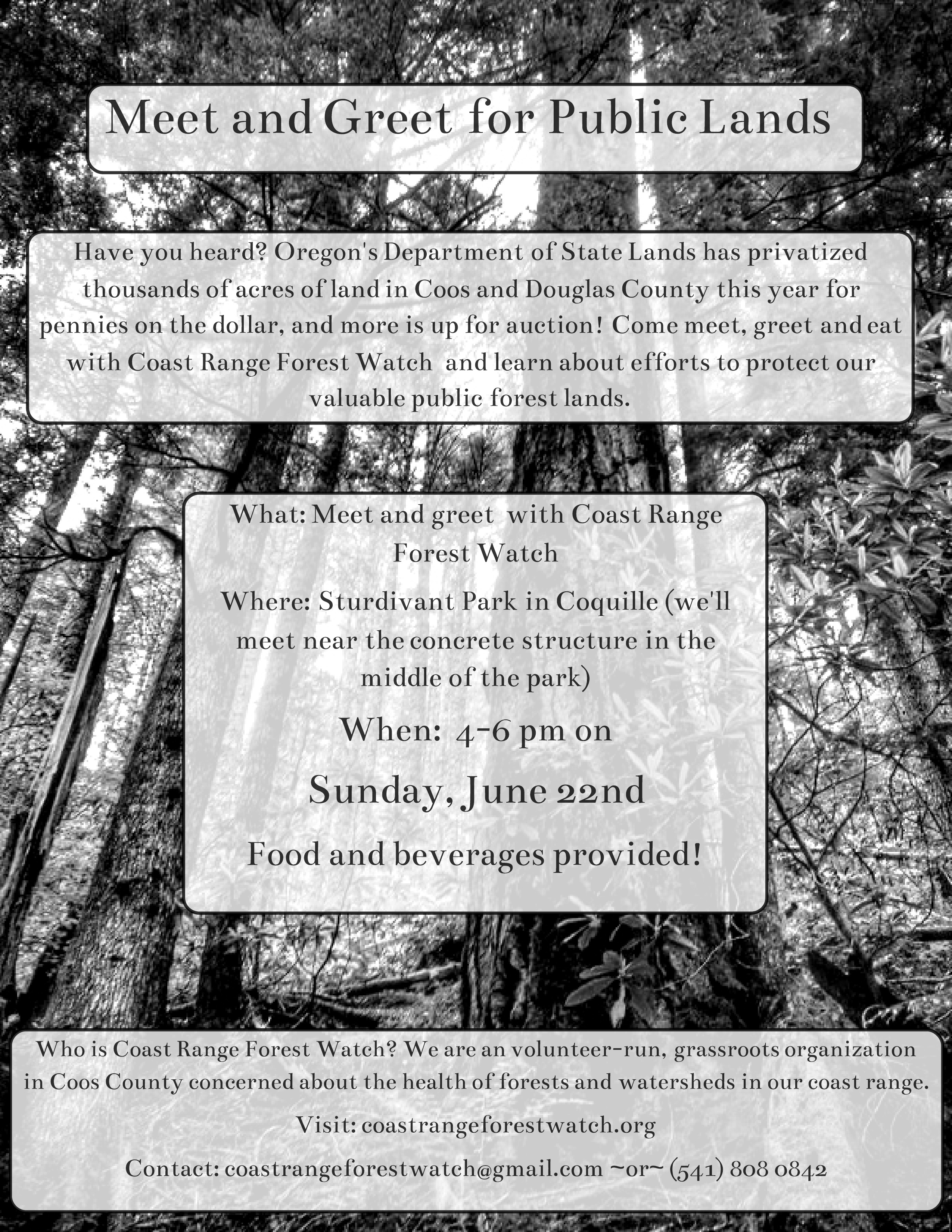 On Sunday, June 22nd at 4 pm, we invite you to meet, greet and eat with Coast Range Forest Watch at Studevant Park in Coquille. Come hear about our efforts to protect valuable public forest lands in Coos County and how you can get involved. Share information about the projects you are working on and how we can support you. Most importantly, get to know us and each other while enjoying free food and drink by the river! This will be a fairly informal event– families welcome. There is another